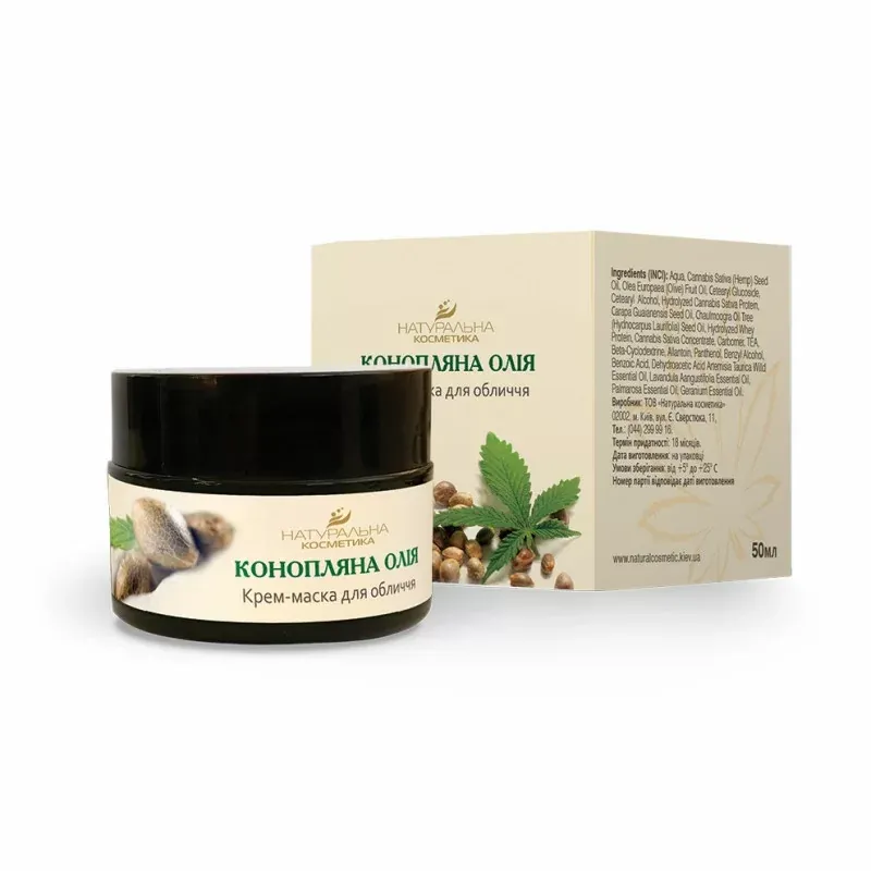 Крем-маска для обличчя «Конопляна Олія» - новинка в лінії косметики "Конопляна Олія" по догляду за шкірою обличчя і тіла. Чудові інгредієнти забезпечують живлення і оновлення шкіри, завдяки активній формулі маска сприяє вдосконаленню зовнішнього вигляду шкіри. Гідролізат протеїнів конопель відновлює природний баланс шкіри, повертаючи їй гладкість і пружність. Маска надає антибактеріальний ефект, усуває небажаний блиск і вирівнює тон шкіри.